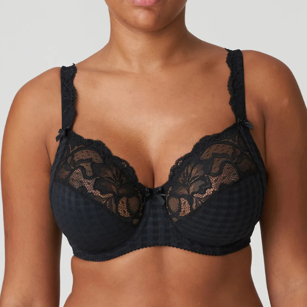 Matilda är en snygg BH från Elomi i färgen svart. Denna BH är en fullkupa med bygel, vilket innebär att den går upp ordentligt och sluter om hela bröstet. Bygeln är något lägra mellan kuporna vilket gör att denna BH blir lite nättare i modellen. Kuporna är ovadderade. I kuporna har finns sömmar som delar upp kupan i fyra delar. Det är sömmarna som lyfter bröstet. I denna BH får du in bröstet från sidan vilket ger dig en nättare siluett. Det är ett tunt tyg i kuporna som är lite lätt transparent. Upptill på kupan har du en snygg silverbrodyr. Axelbanden är breda och reglerbara. På axelbanden har du en så kallad J-hook. Det är en krok som du kan knäppa ihop så att du får en brottarrygg.