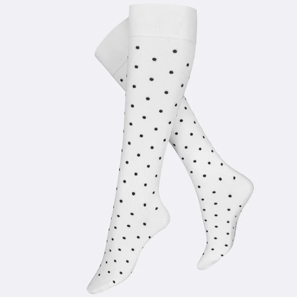 Mjuka stödstrumpor från Vogue. Denna strumpa sitter åt över vaden för att förhindra att benen svullnar. Passar perfekt att använda till vardags om man lätt får svullna ben. Fungerar alldeles utmärkt att ha när man flyger. Går hela vägen upp till knät och har en bres resår som gör att den sitter ordentligt hela dagen utan att kana ner.